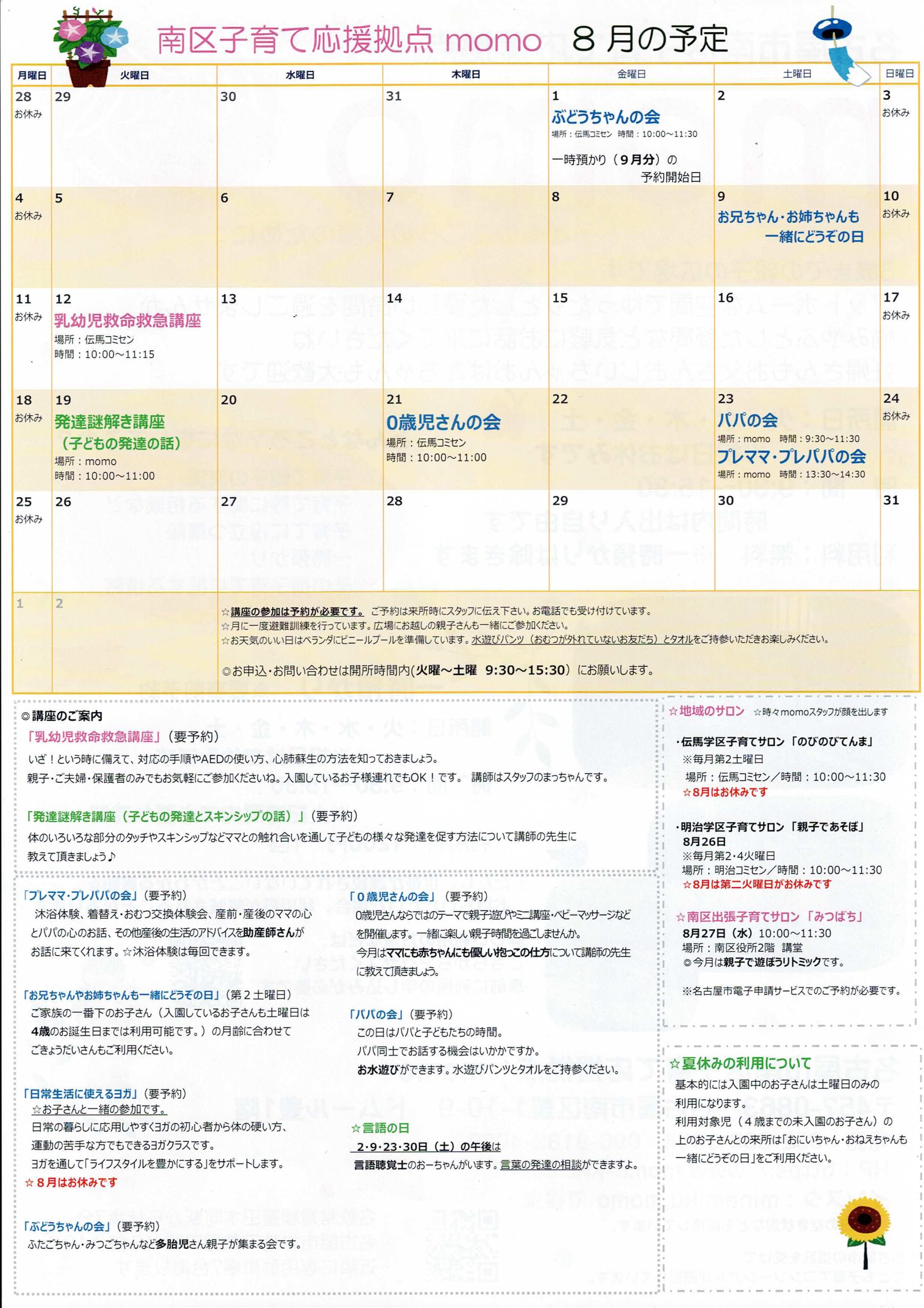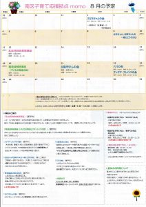 2025年7月25日 / 最終更新日時 : 2025年7月25日 名古屋市子育て応援拠点momo 地域子育て支援拠点momo 南区子育て応援拠点momo 8月カレンダー こんにちは。 8月のカレンダーができました。 講座等のご参加は来所時またはお電話にてご予約承っています。 暑さも本番!!momoでは水遊び開催中です。 水遊びパンツとタオルをご持参して遊びに来てくださいね。 直射日光は当たらない様にシェードをしています。 水遊び大好きな子どもたち、この夏水遊びデビューの小さな子どもたち みんなそれぞれ楽しむ様子にホッコリしています。 おとなも手足を水につけるとチョッピリ涼しく感じられるみたいですよ。