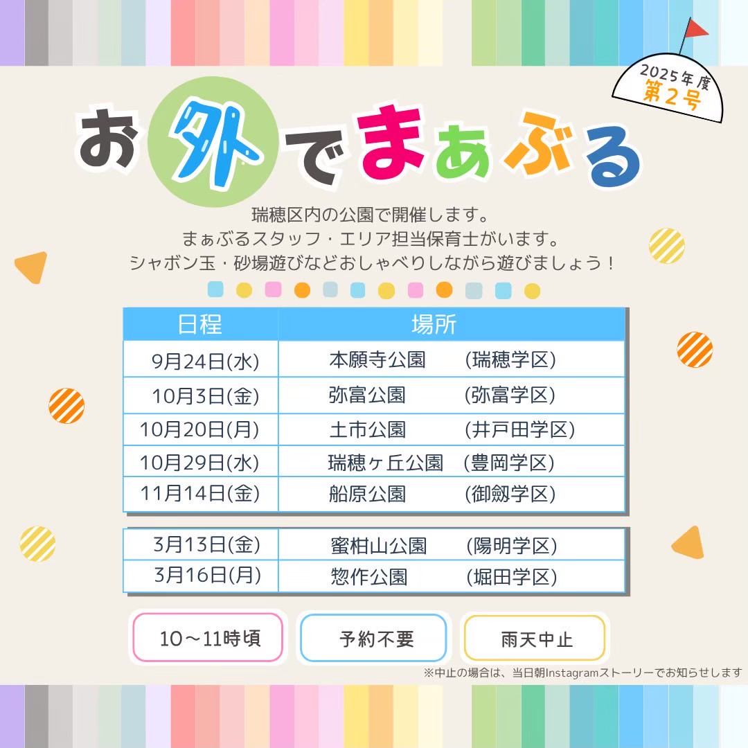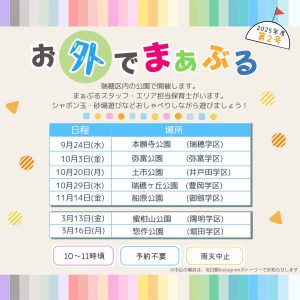 今回は豊岡学区です♪ まぁぶるスタッフ、エリア支援保育士がいます。 お外でおしゃべりしながら遊びましょう!通常の広場も開所しています。